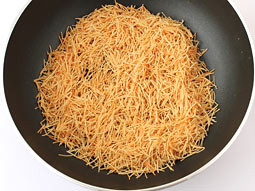 在一个炒锅(kadhai)中,用中火烘烤米粉,用铲子不断搅拌,直到米粉变成浅棕色。将烘烤过的米粉取出放在一个盘子中。