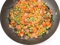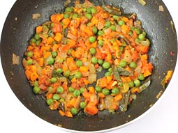 加入切碎的胡萝卜、豌豆粒、切碎的番茄和姜黄粉。撒上盐,充分混合均匀。