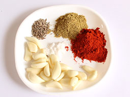 将大蒜瓣、孜然籽、香菜籽粉、红辣椒粉和盐放入搅拌机的小研磨杯中。将它们粗磨(研磨时不要加水)。
