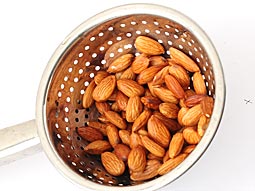 让其浸泡约5-6分钟。将杏仁放入漏勺或筛子中,沥干多余的水。用1杯常温水冲洗。