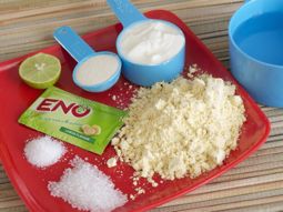 - 在一份中加入 1/2 茶匙 Eno 果盐,充分搅拌一分钟,然后立即倒入已润滑的盘子中。