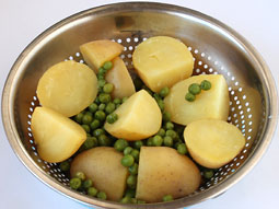 在高压锅中,将青豌豆粒和土豆加入盐和水,煮至变软,或蒸至变软。煮熟后,用大滤网捞出,沥干多余水分。将土豆去皮,轻轻捣碎或切成小块。
