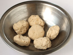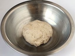 将它们充分混合。然后,逐渐向混合物中加入水,揉成比烙饼面团稍硬一些的面团。用湿纱布或盘子盖住面团,静置 15-20 分钟。