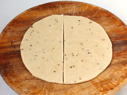 取一个面团球,用手掌轻轻压扁。将其放在擀面板上,用擀面杖擀成直径约 5-6 英寸的圆形薄饼。用刀从中间切开。