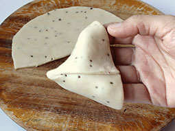 用湿润的手指或刷子将上边缘润湿,然后用拇指和手指用力按压,将其封口。用同样的方法制作所有萨摩萨。