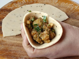 填入 2-3 汤匙馅料。不要填太多,否则下一步无法将上边缘完全封口。