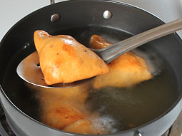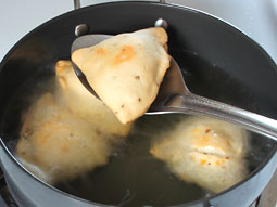 如果您想提前为客人准备,可以在萨摩萨变成浅棕色时捞出,待食用时再次油炸至金黄色。如果您不想进行二次油炸,则在此步骤中不要捞出,直接炸透。