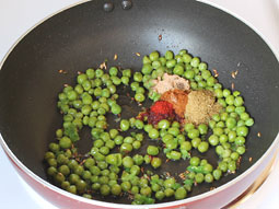 加入煮熟的青豌豆粒,翻炒 1 分钟。加入红辣椒粉、香菜粉、葛拉姆马萨拉粉、干芒果粉和茴香粉。